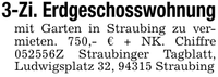 3-Zi. Erdgeschosswohnungmit Garten in Straubing zu vermieten. 750,- € + NK. Chiffre ***Z Straubinger Tagblatt, Ludwigsplatz 32, 94315 Straubing