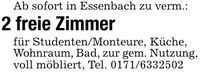 Ab sofort in Essenbach zu verm.:2 freie Zimmerfür Studenten/Monteure, Küche, Wohnraum, Bad, zur gem. Nutzung,voll möbliert, Tel. ***