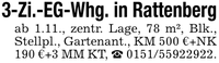 3-Zi.-EG-Whg. in Rattenbergab 1.11., zentr. Lage, 78 m², Blk., Stellpl., Gartenant., KM 500 €+NK 190 €+3 MM KT, _ ***.