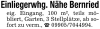 Einliegerwhg. Nähe Bernriedeig. Eingang, 100 m², teils möbliert, Garten, 3 Stellplätze, ab sofort zu verm., _ ***.