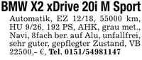 BMW X2 xDrive 20i M SportAutomatik, EZ 12/18, 55000 km, HU 9/26, 192 PS, AHK, grau met., Navi, 8fach ber. auf Alu, unfallfrei, sehr guter, gepflegter Zustand, VB 22500,- €, Tel. ***