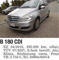 B 180 CDI EZ ***, 295.000 km, silber, TÜV ***, 8-fach bereift, Alu, Klima, Sitzheizung vorne, Preis VB: 2.750 €, Tel. ***