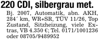 220 CDI, silbergrau met.Bj. 2007, Automatik, abn. AKH, 284' km, WR+SR, TÜV 11/26, Top Zustand, Sitzheizung, viele Extras, VB 4.350 €; Tel. *** oder ***