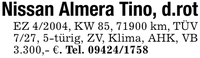 Nissan Almera Tino, d.rotEZ 4/2004, KW 85, 71900 km, TÜV 7/27, 5-türig, ZV, Klima, AHK, VB 3.300,- €. Tel. ***