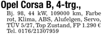 Opel Corsa B, 4-trg.,Bj. 98, 44 kW, *** km, Farbe rot, Klima, ABS, Alufelgen, Servo, TÜV 5/27, Top Zustand, FP 1.290 € Tel. ***