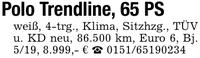 Polo Trendline, 65 PSweiß, 4-trg., Klima, Sitzhzg., TÜV u. KD neu, 86.500 km, Euro 6, Bj. 5/19, 8.999,- € _ ***