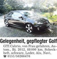 Gelegenheit, gepflegter Golf GTI Cabrio, von Frau gefahren, Autom., Bj. 2012, 88 000 km, Scheckheft, schwarz, Leder, Alu, Navi, _ ***