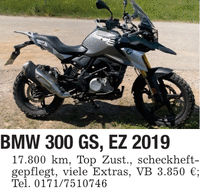 BMW 300 GS, EZ ***.800 km, Top Zust., scheckheftgepflegt, viele Extras, VB 3.850 €; Tel. ***