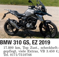 BMW 310 GS, EZ ***.800 km, Top Zust., scheckheftgepflegt, viele Extras, VB 3.450 €; Tel. ***