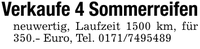 Verkaufe 4 Sommerreifenneuwertig, Laufzeit 1500 km, für 350.- Euro, Tel. ***