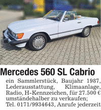 Mercedes 560 SL Cabrioein Sammlerstück, Baujahr 1987, Lederausstattung, Klimaanlage, Radio, H-Kennzeichen, für 27.500 € umständehalber zu verkaufen;Tel. ***, Anrufe jederzeit