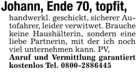 Johann, Ende 70, topfit, handwerkl. geschickt, sicherer Autofahrer, leider verwitwet. Brauche keine Haushälterin, sondern eine liebe Partnerin, mit der ich noch viel unternehmen kann. PV,Anruf und Vermittlung garantiert kostenlos Tel. ***