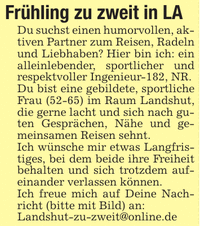 Frühling zu zweit in LADu suchst einen humorvollen, aktiven Partner zum Reisen, Radeln und Liebhaben? Hier bin ich: ein alleinlebender, sportlicher und respektvoller Ingenieur-182, NR.Du bist eine gebildete, sportliche Frau (52-65) im Raum Landshut, die gerne lacht und sich nach guten Gesprächen, Nähe und gemeinsamen Reisen sehnt.Ich wünsche mir etwas Langfristiges, bei dem beide ihre Freiheit behalten und sich trotzdem aufeinander verlassen können.Ich freue mich auf Deine Nachricht (bitte mit Bild) an:Landshut-zu-zweit@online.de