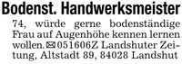 Bodenst. Handwerksmeister74, würde gerne bodenständige Frau auf Augenhöhe kennen lernen wollen. _ ***Z Landshuter Zeitung, Altstadt 89, 84028 Landshut