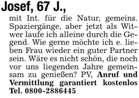 Josef, 67 J., mit Int. für die Natur, gemeins. Spaziergänge, aber jetzt als Witwer laufe ich alleine durch die Gegend. Wie gerne möchte ich e. lieben Frau wieder ein guter Partner sein. Wäre es nicht schön, die noch vor uns liegenden Jahre gemeinsam zu genießen? PV, Anruf und Vermittlung garantiert kostenlos Tel. ***