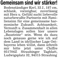 Gemeinsam sind wir stärker!Bodenständiger Kerl, 32 J., 187 cm, schlank, vorzeigbar, zuverlässig mit Herz u. Gefühl sucht liebevolle naturbewußte Partnerin mit Familiensinn für eine gemeinsame harmonische Zukunft. Achtsamkeit, Vernunft u. Zusammenhalt in allen Lebenslagen sollen hier unsere "Bausteine" sein. Wenn du dazu noch genauso gerne wie ich auf dem Land in idyllischer Lage Ostbayerns leben willst, dann schreib mir bitte jetzt unter Chiffre ***Z Straubinger Tagblatt, Ludwigsplatz 32, 94315 Straubing