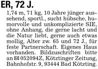ER, 72 J.1,74 m, 71 kg, 10 Jahre jünger aussehend, sportl., sucht hübsche, humorvolle und unkomplizierte SIE, ohne Anhang, die gerne lacht und die Natur liebt, gerne auch etwas mollig, Alter zw. 65 und 72 J., für feste Partnerschaft. Eigenes Haus vorhanden. Bildzuschriften bitte an _ ***Z, Kötztinger Zeitung, Bahnhofstr. 9, 93444 Bad Kötzting.