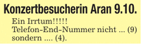 Konzertbesucherin Aran 9.10.Ein Irrtum!!!!!Telefon-End-Nummer nicht ... (9) sondern .... (4).