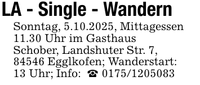 LA - Single - WandernSonntag, 5.10.2025, Mittagessen 11.30 Uhr im GasthausSchober, Landshuter Str. 7, 84546 Egglkofen; Wanderstart: 13 Uhr; Info: _ ***