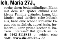 Ich, Maria 27J.,suche einen bodenständigen Mann mit dem ich später einmal eine kleine Familie gründen kann, bin kinder- und tierlieb, sehe hübsch aus, habe eine schöne schlanke Figur, bin natürlich, zuverlässig, humorvoll, kann prima kochen u. backen. Interesse? Ruf gleich an üb. _ *** o. schick eine SMS. www.die-wolke-7.de