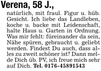 Verena, 58 J.,natürlich, mit fraul. Figur u. hüb. Gesicht. Ich liebe das Landleben, koche u. backe mit Leidenschaft, halte Haus u. Garten in Ordnung. Was mir fehlt: füreinander da sein, Nähe spüren, gebraucht u. geliebt werden. Findest Du auch, dass alles zu zweit schöner ist? Dann melde Dich üb. PV, ich freue mich sehr auf Dich. Tel. ***