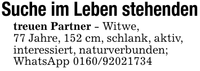 Suche im Leben stehendentreuen Partner - Witwe, 77 Jahre, 152 cm, schlank, aktiv,interessiert, naturverbunden; WhatsApp ***