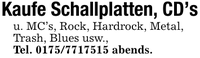 Kaufe Schallplatten, CDs u. MCs, Rock, Hardrock, Metal, Trash, Blues usw., Tel. *** abends.