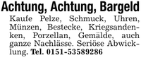Achtung, Achtung, BargeldKaufe Pelze, Schmuck, Uhren, Münzen, Bestecke, Kriegsandenken, Porzellan, Gemälde, auch ganze Nachlässe. Seriöse Abwicklung. Tel. ***