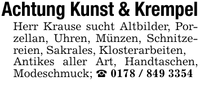 Achtung Kunst & KrempelHerr Krause sucht Altbilder, Porzellan, Uhren, Münzen, Schnitzereien, Sakrales, Klosterarbeiten,Antikes aller Art, Handtaschen, Modeschmuck; _ ***