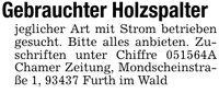 Gebrauchter Holzspalterjeglicher Art mit Strom betrieben gesucht. Bitte alles anbieten. Zuschriften unter Chiffre ***A Chamer Zeitung, Mondscheinstraße 1, 93437 Furth im Wald
