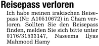 Reisepass verlorenIch habe meinen irakischen Reisepass (Nr. A***) in Cham verloren. Sollten Sie den Reisepass finden, melden Sie sich bitte unter ***, Naseema Ilyas Mahmood Hamy