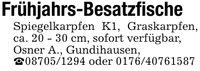 Frühjahrs-BesatzfischeSpiegelkarpfen K1, Graskarpfen, ca. 20 - 30 cm, sofort verfügbar,Osner A., Gundihausen,_*** oder ***