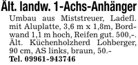 Ält. landw. 1-Achs-Anhänger Umbau aus Miststreuer, Ladefl. mit Aluplatte, 3,6 m x 1,8m, Bordwand 1,1 m hoch, Reifen gut. 500,-. Ält. Küchenholzherd Lohberger, 90 cm, AS links, braun, 50.- Tel. ***