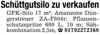 Schüttgutsilo zu verkaufenGFK-Silo 17 m³; Amanzone Düngerstreuer ZA-F804r; Pflanzenschutzspritze 600 L, 10 m; Sähkombination 2,5m, _ ***