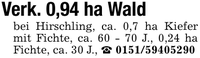 Verk. 0,94 ha Waldbei Hirschling, ca. 0,7 ha Kiefer mit Fichte, ca. 60 - 70 J., 0,24 ha Fichte, ca. 30 J., _ ***