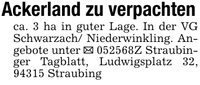 Ackerland zu verpachtenca. 3 ha in guter Lage. In der VG Schwarzach/ Niederwinkling. Angebote unter _ ***Z Straubinger Tagblatt, Ludwigsplatz 32, 94315 Straubing