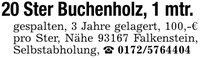 20 Ster Buchenholz, 1 mtr. gespalten, 3 Jahre gelagert, 100,-€ pro Ster, Nähe 93167 Falkenstein, Selbstabholung, _ ***