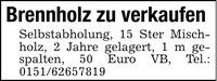 Brennholz zu verkaufenSelbstabholung, 15 Ster Mischholz, 2 Jahre gelagert, 1 m gespalten, 50 Euro VB, Tel.: ***