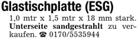 Glastischplatte (ESG)1,0 mtr x 1,5 mtr x 18 mm stark. Unterseite sandgestrahlt zu verkaufen. _ ***