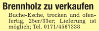 Brennholz zu verkaufenBuche-Esche, trocken und ofenfertig, 25er/33er; Lieferung ist möglich; Tel. ***