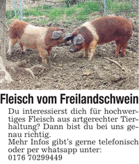 Fleisch vom Freilandschwein Du interessierst dich für hochwertiges Fleisch aus artgerechter Tierhaltung? Dann bist du bei uns genau richtig. Mehr Infos gibt's gerne telefonisch oder per whatsapp unter: ***