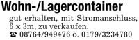 Wohn-/Lagercontainergut erhalten, mit Stromanschluss, 6 x 3m, zu verkaufen._ *** o. ***