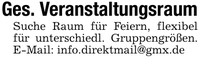 Ges. VeranstaltungsraumSuche Raum für Feiern, flexibel für unterschiedl. Gruppengrößen. E-Mail: info.direktmail@gmx.de