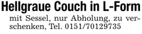 Hellgraue Couch in L-Formmit Sessel, nur Abholung, zu verschenken, Tel. ***