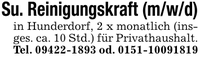 Su. Reinigungskraft (m/w/d)in Hunderdorf, 2 x monatlich (insges. ca. 10 Std.) für Privathaushalt.Tel. *** od. ***