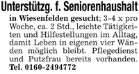 Unterstützg. f. Seniorenhaushaltin Wiesenfelden gesucht; 3-4 x pro Woche, ca. 2 Std., leichte Tätigkeiten und Hilfestellungen im Alltag, damit Leben in eigenen vier Wänden möglich bleibt. Pflegedienst und Putzfrau bereits vorhanden. Tel. ***
