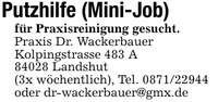 Putzhilfe (Mini-Job)für Praxisreinigung gesucht.Praxis Dr. WackerbauerKolpingstrasse 483 A84028 Landshut (3x wöchentlich), Tel. ***oder dr-wackerbauer@gmx.de