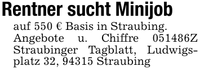 Rentner sucht Minijobauf 550 € Basis in Straubing.Angebote u. Chiffre ***Z Straubinger Tagblatt, Ludwigsplatz 32, 94315 Straubing