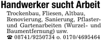Handwerker sucht ArbeitTrockenbau, Fliesen, Altbau,Renovierung, Sanierung, Pflaster- und Gartenarbeiten (Wurzel- und Baumentfernung) usw._ *** o. ***