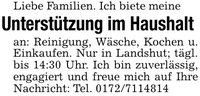 Liebe Familien. Ich biete meine Unterstützung im Haushalt an: Reinigung, Wäsche, Kochen u. Einkaufen. Nur in Landshut; tägl. bis 14:30 Uhr. Ich bin zuverlässig, engagiert und freue mich auf Ihre Nachricht: Tel. ***